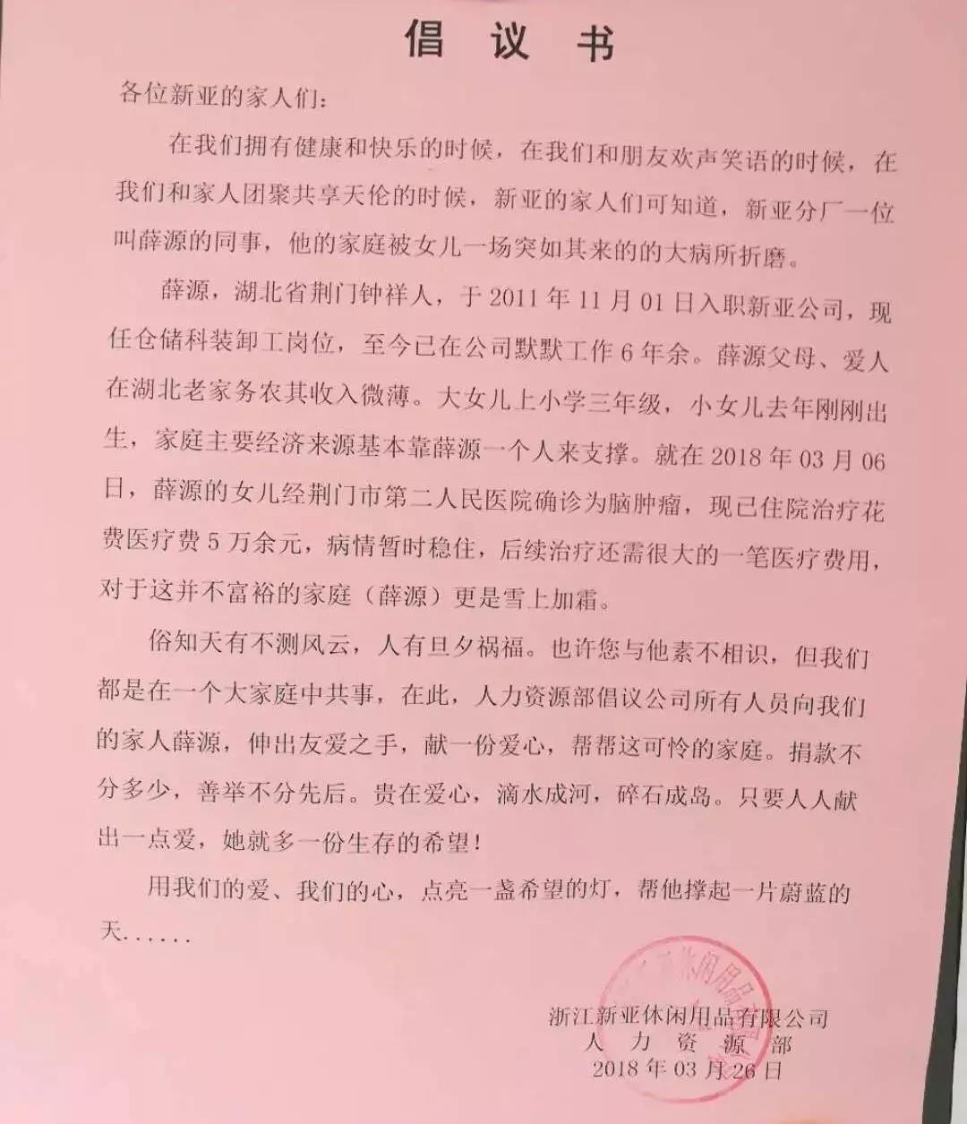 日前,公司老员工薛源年仅9岁的女儿在湖北省经荆门市第二人民医院确诊为脑肿瘤,病情较为严重,经过多天的积极治疗,女儿的病情终于得到了初步的控制,但此时高昂的治疗费已花光薛源历年来的积蓄。女儿病情的后续治疗仍然还需要很大一笔医疗费用,这笔费用对于此时的薛源一家来说无异于雪上加霜。
