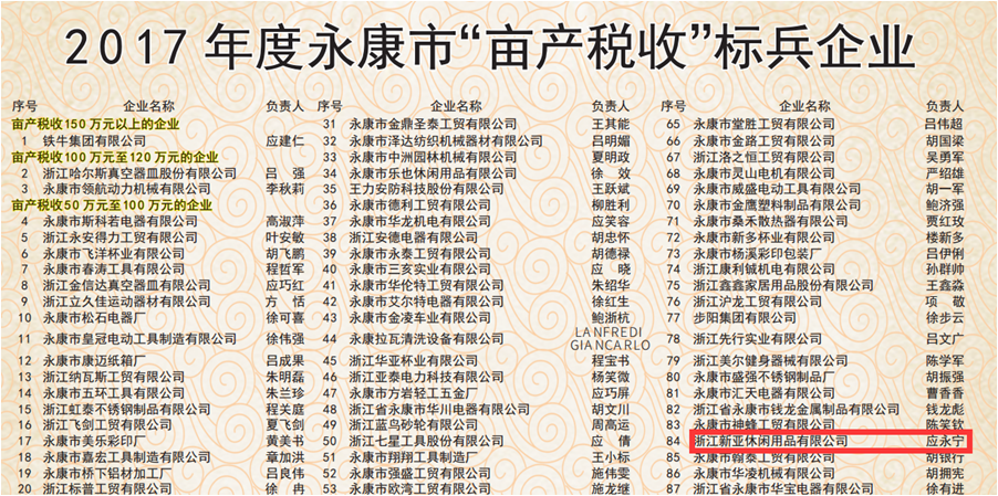 在本次表彰大会中,我司浙江新亚休闲用品有限公司以亩产税收24万元以上成绩,荣获“亩产税收”标兵企业,获得土地使用税100%减免最高荣誉。