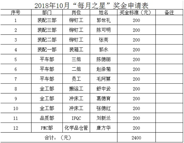 本次仪式本着合理化、公平化和公开化的原则,在各参选部门推荐的基础上,层层选拔、公示,最终评选出12名表现优异的工作者。经公司研究决定,授予这12名同志2018年10月每月之星称号,并为他们颁发荣誉勋章及200元现金奖励。评选结果公示如下: